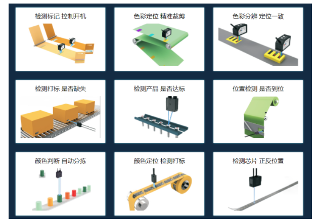 顏色傳感器主要用于檢測目標物體表面顏色,主要在工業、醫療和安防系統中有著廣泛的應用。常見用途有混料檢測、有無檢測、污漬檢測等等。采用傳統光電傳感器通過反射光量之差進行檢測時,可能會檢測背景、受背景影響導致無法對檢測物體執行穩定檢測的現象。如果采用通過顏色傳感器輸出各檢測物體顏色信號的方式,有時可確認檢測物體的有無。