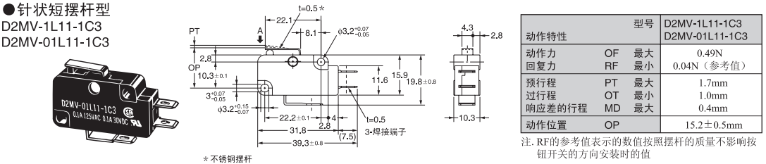 歐姆龍微動開關,D2MV-01L22-1C2,歐姆龍微動開關D2MV