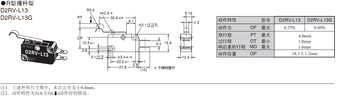 歐姆龍微動開關, D2RV-L13,歐姆龍微動開關D2RV