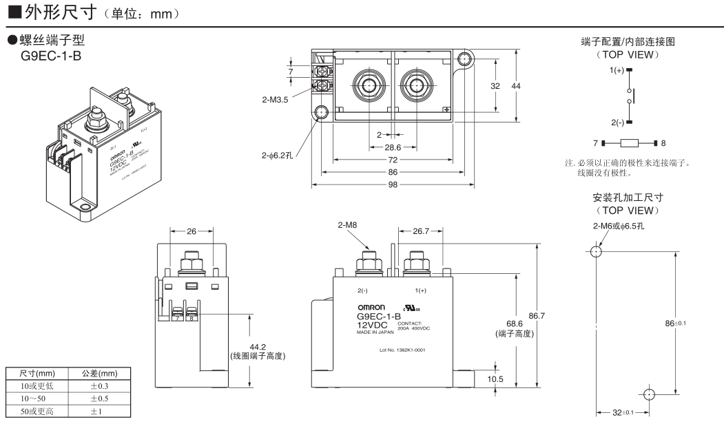 高86.7mm×寬44mm×長98mm的小型繼電器,可以開關DC400V 200A。(最大可切斷DC400V 1,000A)
