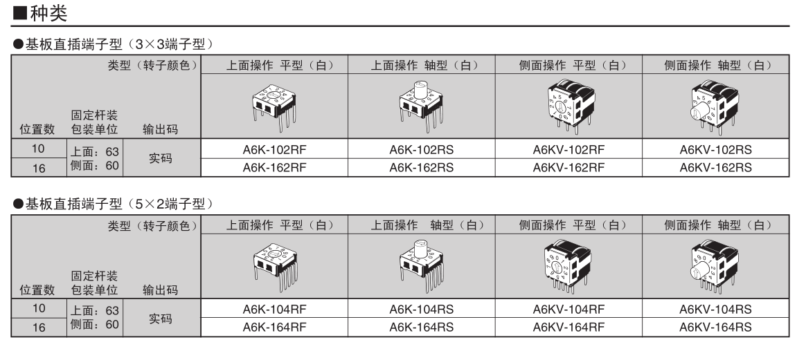 具有表面安裝端子、直插型端子的兩種型號(hào)對(duì)應(yīng)。還提供側(cè)面操作型產(chǎn)品