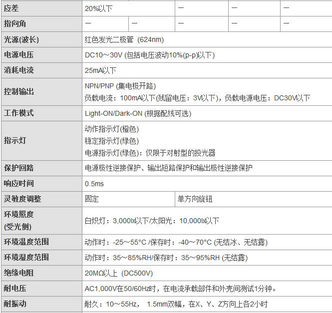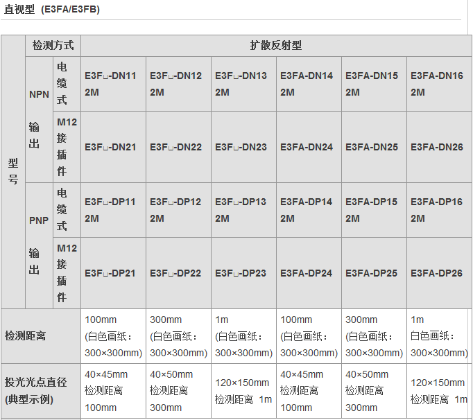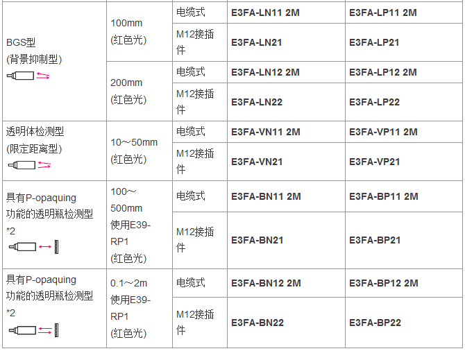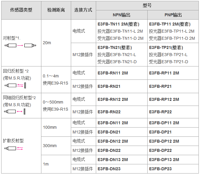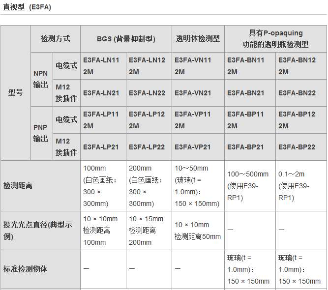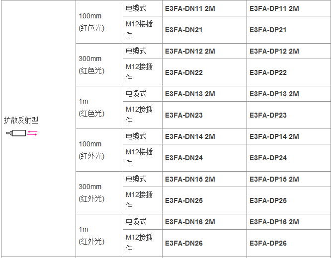 從食品飲料、紡織、制陶制磚到物流,E3FA/E3RA/E3FB型傳感器通常安裝于各行各業(yè)的廠房之中,無(wú)論是何種應(yīng)用總有一款適合您。這一應(yīng)用廣泛的光電傳感器系列具有高可靠性和增強(qiáng)的性能,其中包含對(duì)射型、回歸反射型和擴(kuò)散反射型(具有直視型和側(cè)視型兩種版本)。對(duì)于某些特定應(yīng)用,背景抑制型、限定反射型和透明體檢測(cè)型也提供了直視型版本。